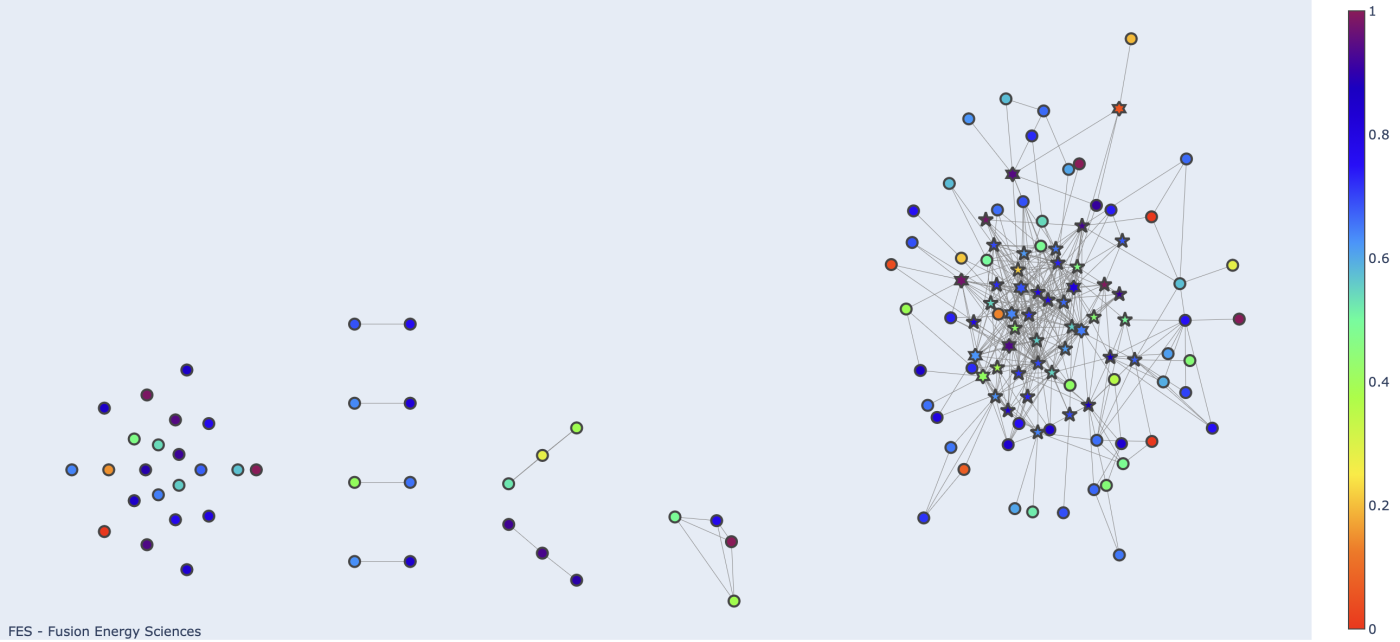 Example NERSC allocation graph from NERSC’s Jupyter notebooks: Fusion Energy Science allocations, colored by the ratio of their allocated hours used.